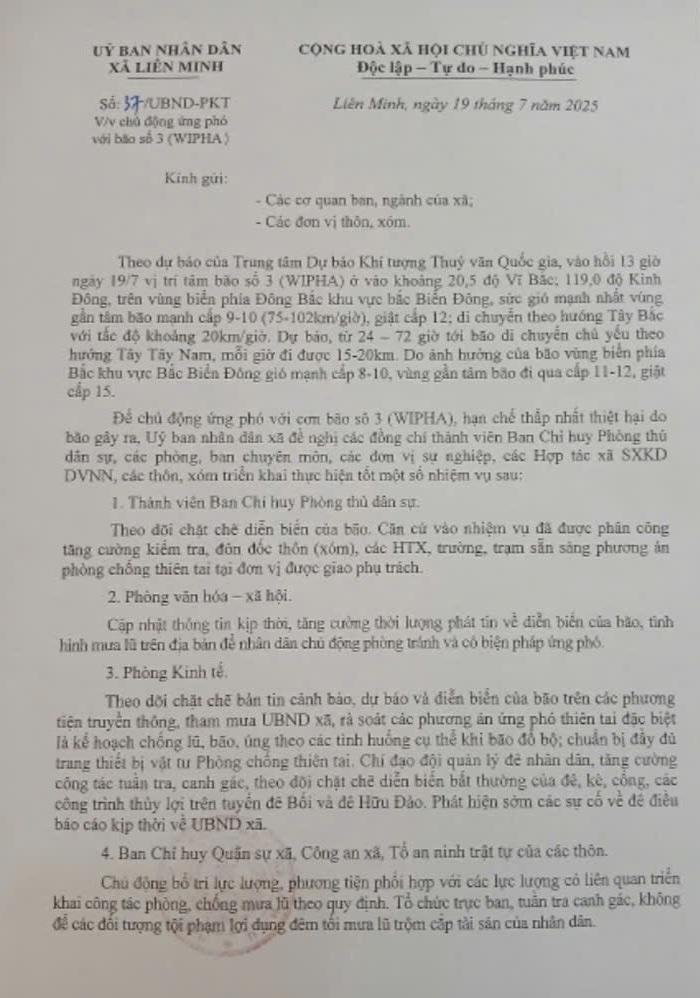 | Trích yếu | Về việc chủ động ứng phó cơn bão số 3 (WIPHA) |